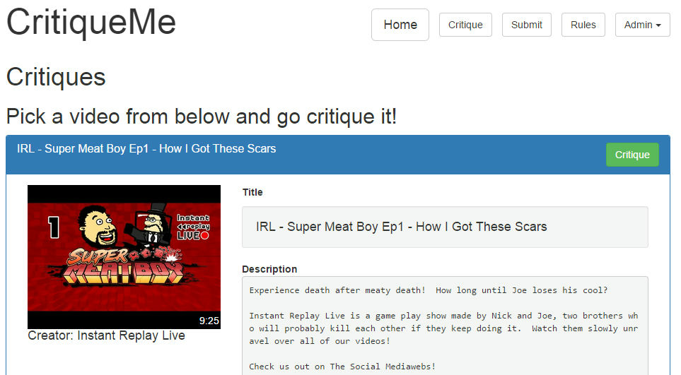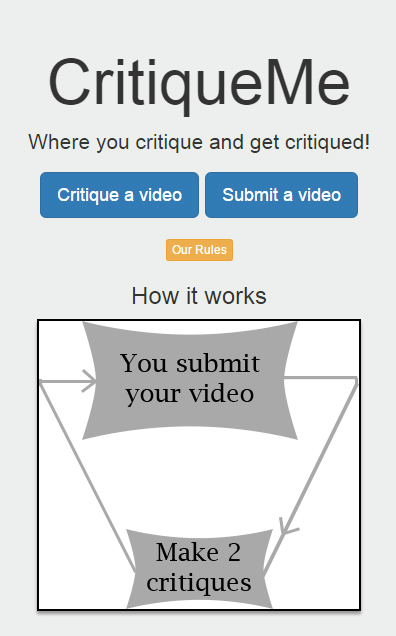 CritiqueMe was a quick week-long project that aimed to alleviate the problem of youtubers posting a video for critique but never leaving any critiques themselves. This site solves the issue by forcing the channel to leave a critique first in order to post a video.