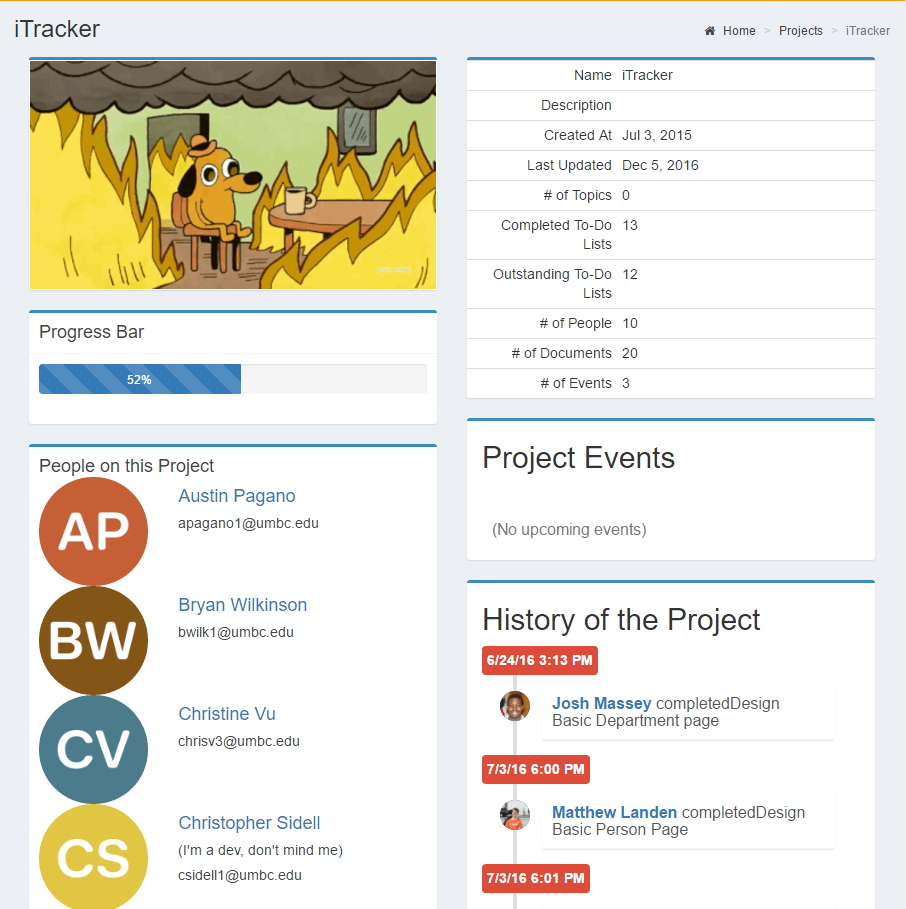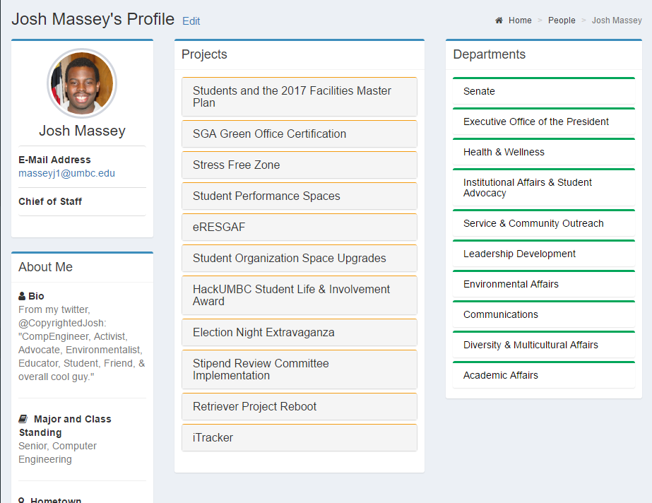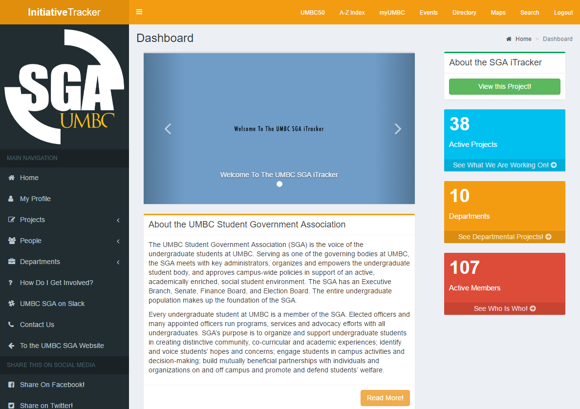 The iTracker project existed to increase general student involvement with the SGA. It aggregated information from their backend project service Basecamp and allowed students to interact and have the opportunity to jump into projects.